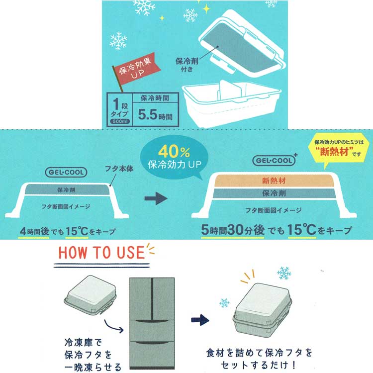 保冷剤や断熱材が完全に外気に触れない構造のため、弁当箱の上に保冷剤を置いただけのものと比較し保冷効果が高いのが特徴です。