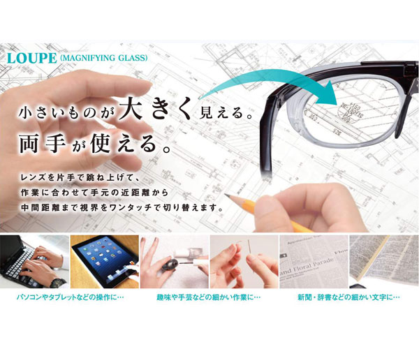 テレビを見たりする普段使いの際 はレンズを跳ね上げ、新聞を読む 時や細かい作業を行う際は、レン ズを下ろしルーペとして使用。