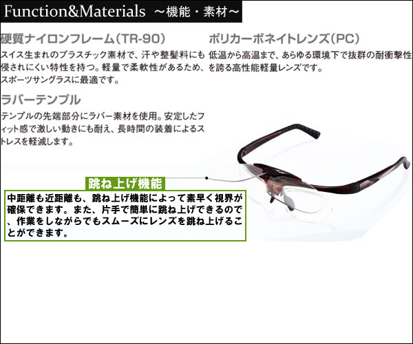◇FUNCTION FRAME×LENS :CLEARBROWN×CLEAR レンズ:プラスチック フレーム:プラスチック・ステンレス・合成ゴム 本体/幅:140mm、奥行140mm 跳ね上げレンズ/幅:126mm、高さ:40mm インナーフレーム/幅:118mm、高さ:35mm インナーレンズ:1.21倍(+1.00) フロントレンズ:1.33倍(+1.50) レンズ2枚合せ:1.61倍(+1.00) ◇POINT 跳ね上げ機能 中距離も近距離も、跳ね上げ機能に よって素早く視界が確保できます。