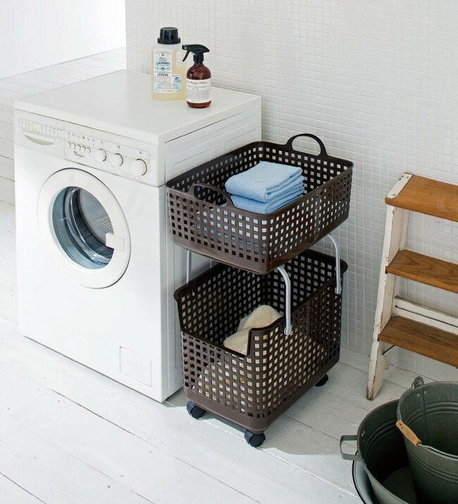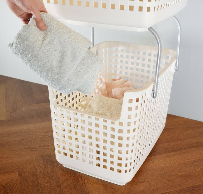 本体サイズ(cm)約33.2×34×46.5cm本体重量(g)約900g素材・材質ポリプロピレン原産国日本2本のハンドルにかかる耐荷重/5kgまで商品説明■ハンドルを垂直に立てて下向きに押し込むだけスタッキングできる、ワゴン感覚で使用出来るバスケット■洗濯機の横などに重ねて使えるランドリーバスケット■上下のバスケットで白物と色柄物を分けたり、トップのバスケットを浅型にすれば脱衣カゴにも限られた空間を有効に利用■スタッキング部のロックをはずせば取っ手付きのバスケットとして洗濯物の持ち運びにも便利■もちろんバスケット単品としての利用にも商品区分 当店では、ギフトラッピング(熨斗対応を含む)はお受けすることができませんので、あらかじめご了承ください
