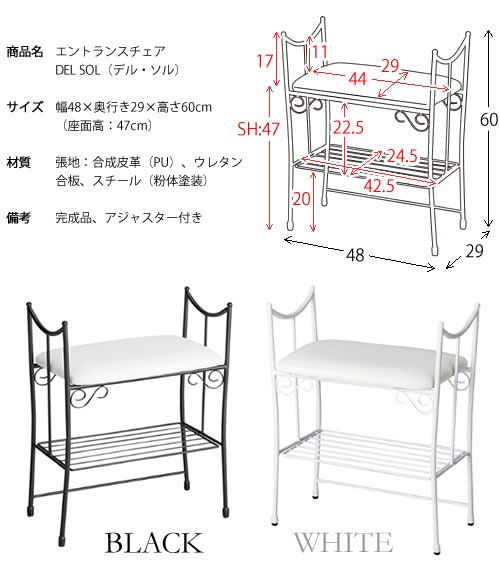 商品名エントランスチェア DEL SOL(デル・ソル) サイズ幅48×奥行き29×高さ60cm(座面高:47cm) 材質張地:合成皮革(PU)、ウレタン、合板、スチール(粉体塗装) 備考完成品、アジャスター付き カラーホワイト、ブラック ■送料:全国一律900円 ※この商品は代引きできません。